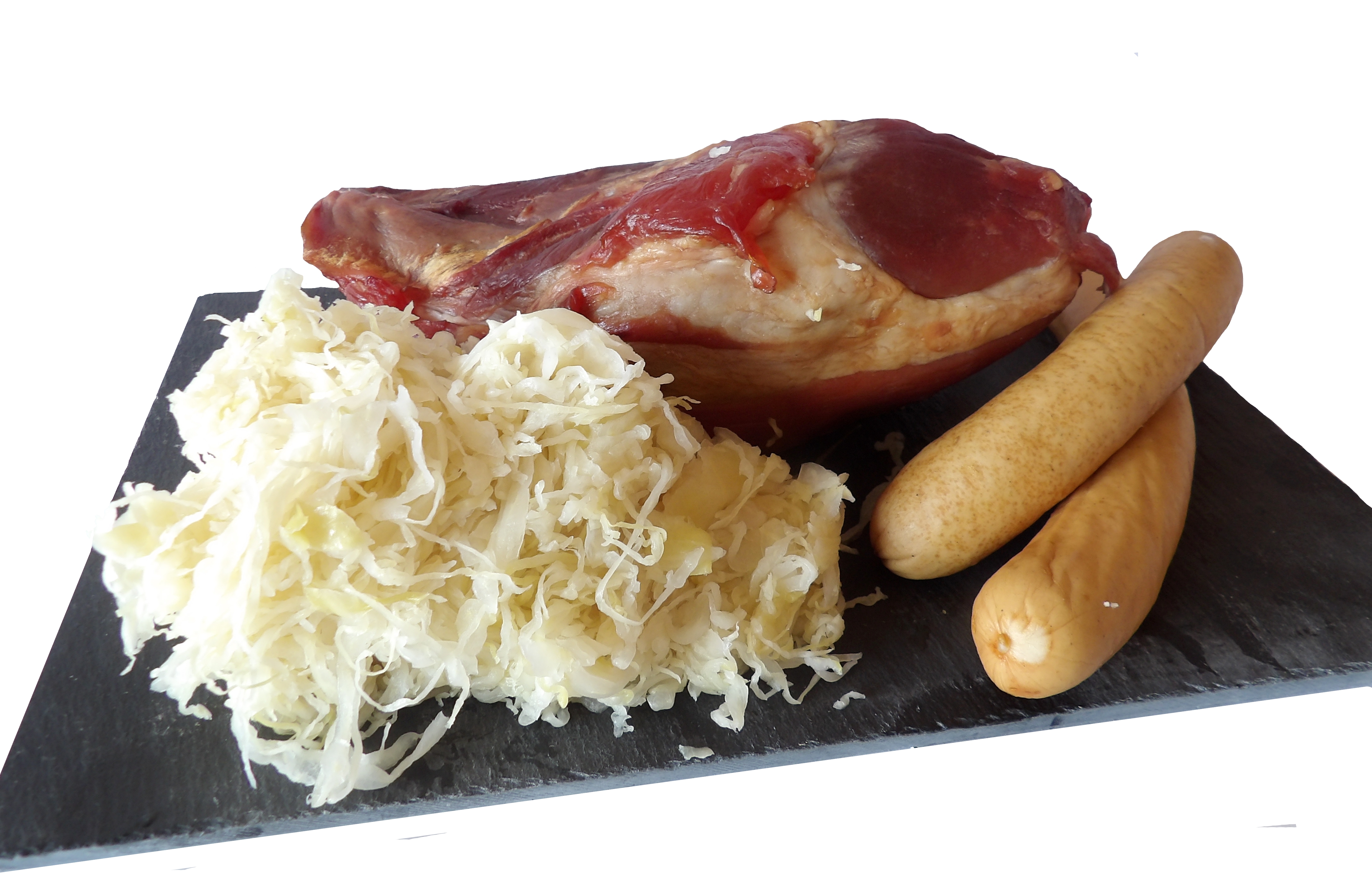Ingrédients : Choucroute : Choux, graisse d'oie/canard (2%), bouillon, épices, Riesling (Sulfites), saindoux, sel, arômes naturels, baies de genièvre.